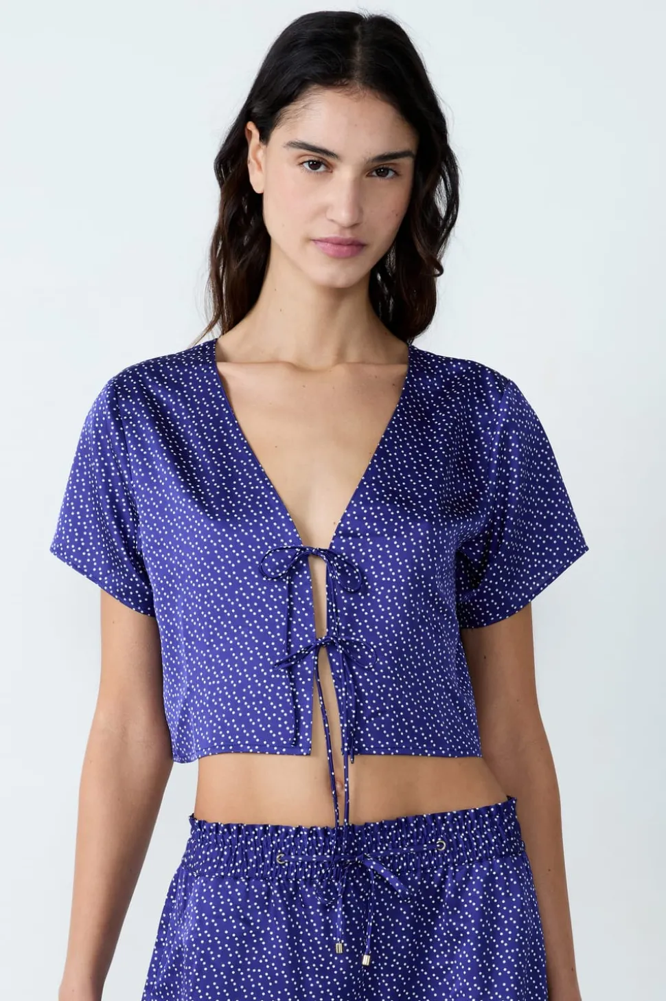 Camisa pijama satinada de manga corta estampada con lazos