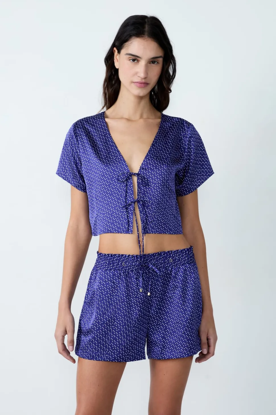 Camisa pijama satinada de manga corta estampada con lazos