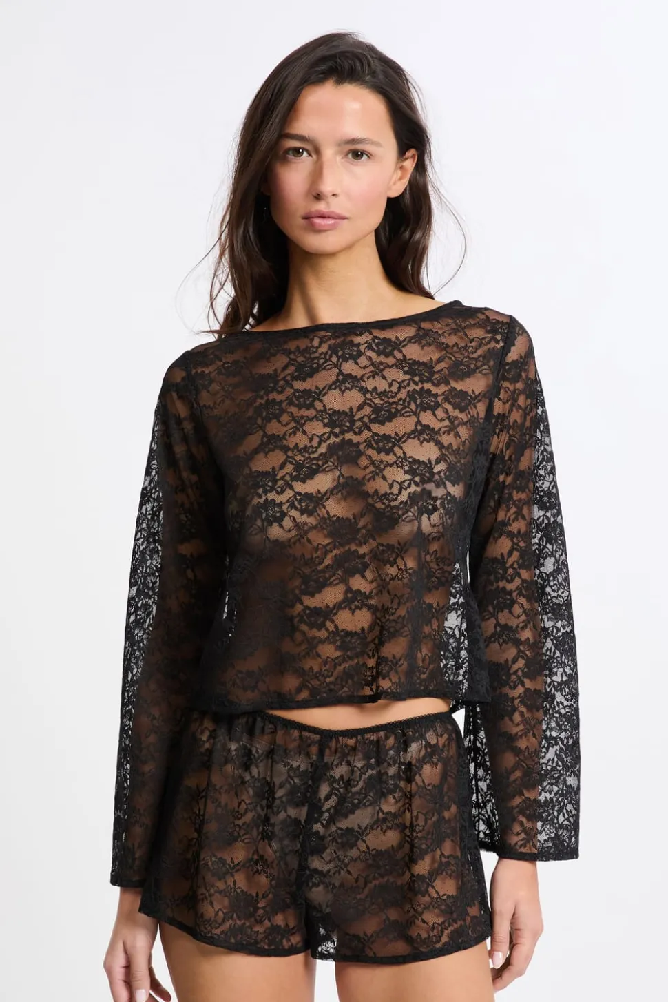 Top de manga larga de encaje transparente